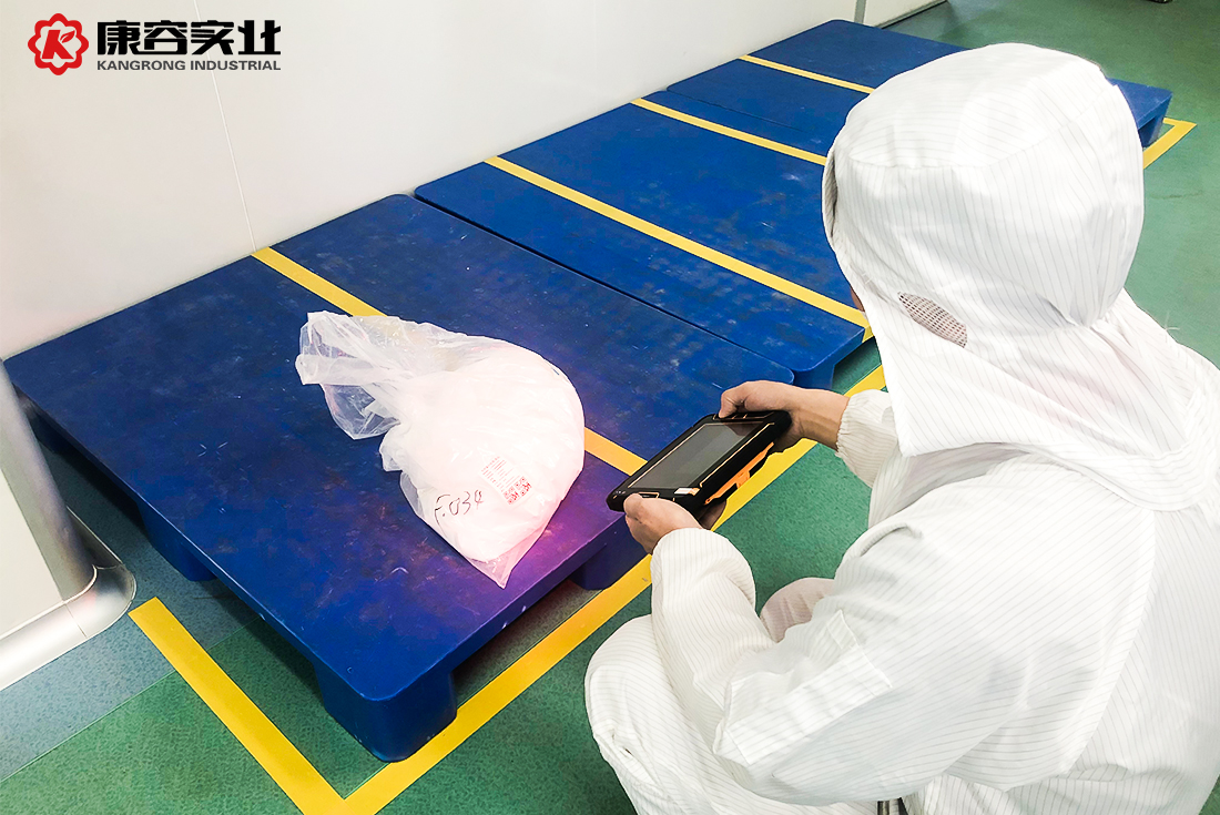 6月14日上午8点40分,康容实业乳化车间,组长李志勇走进车间后打开手中的小平板电脑,输入个人账号和密码,屏幕上便显示了生产任务,随即李志勇便对原料进行投料扫描,按照小平板上显示的原料相别投料,并根据小平板上指示的温度、转速等参数开始操作。以此同时,原料仓管员吕金霞也拿着小平板电脑进行原料入库,并打印入库二维码标签,随后为明天乳化生产的原料进行备料准备。仓管邝佩文也拿着小平板电脑正在进行包材入库、打印标签,准备明天的包材备料。