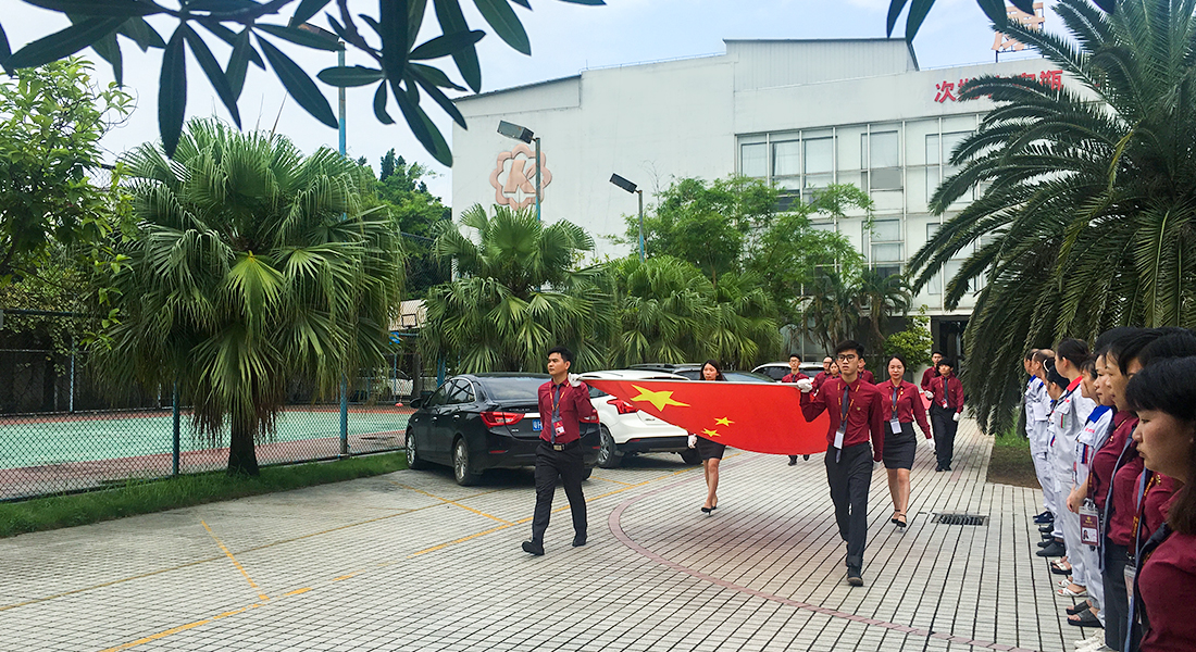7月15日早上8点20分,广东康容实业全体员工集中在国旗广场下,庄重简朴地举行升国旗仪式后,员工代表分享上周工作学习体会、全体员工2分钟健身运动、然后高呼公司名和口号,相互击掌致谢,早会随即结束,员工回到工作岗位,用时15分钟。