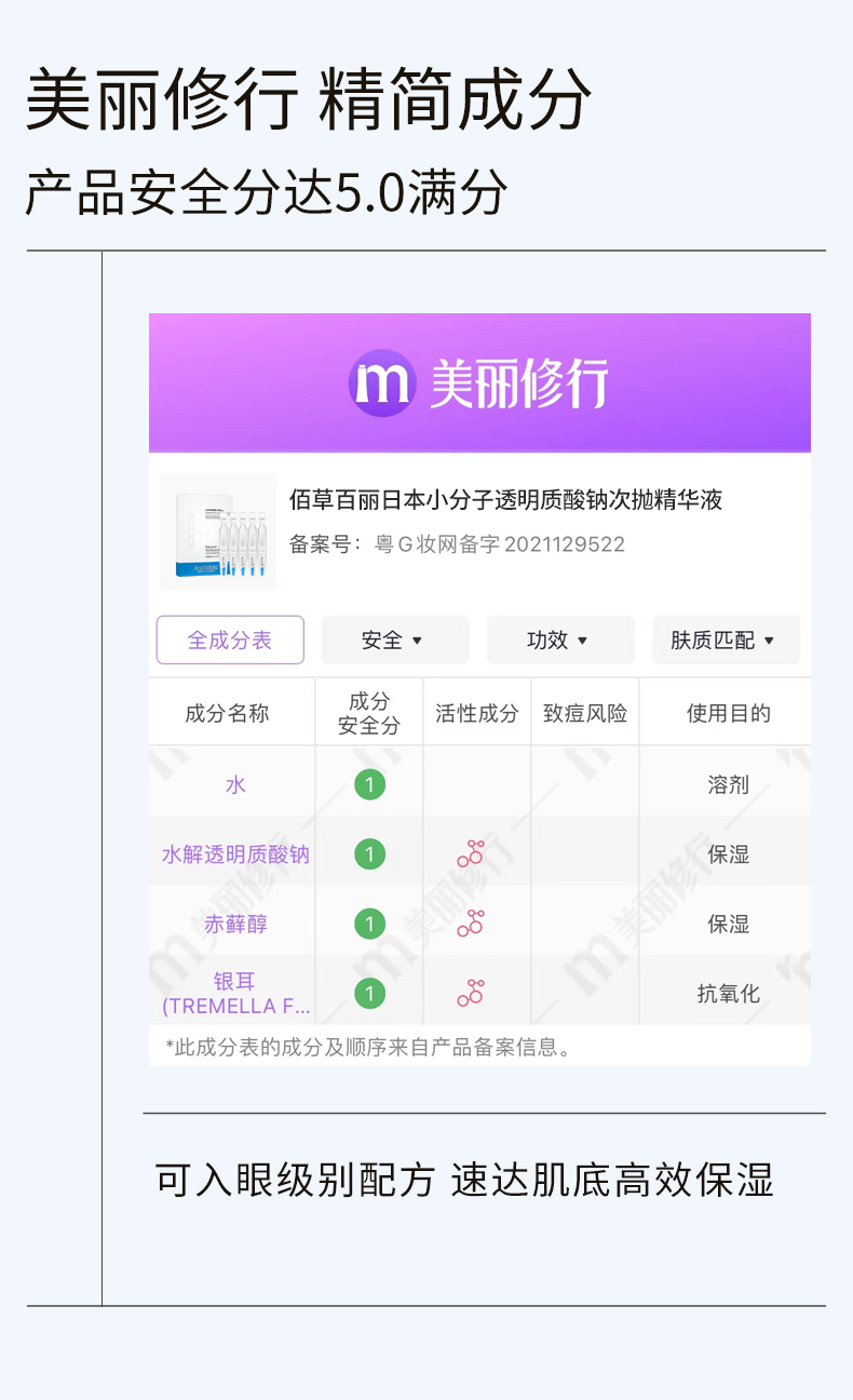 成分突破:小分子透明质酸钠内部保水+银耳提取物外部保水,内外互补达到强效保水,并能促进肌肤紧实度因水分充足而加强。 配方突破:配方仅有4种成分,确保了每一种成分都能发挥出自身最大的功效;亲和肌肤,晒伤/红敏/干热/美容项目后一支补水维稳,百搭不挑皮。